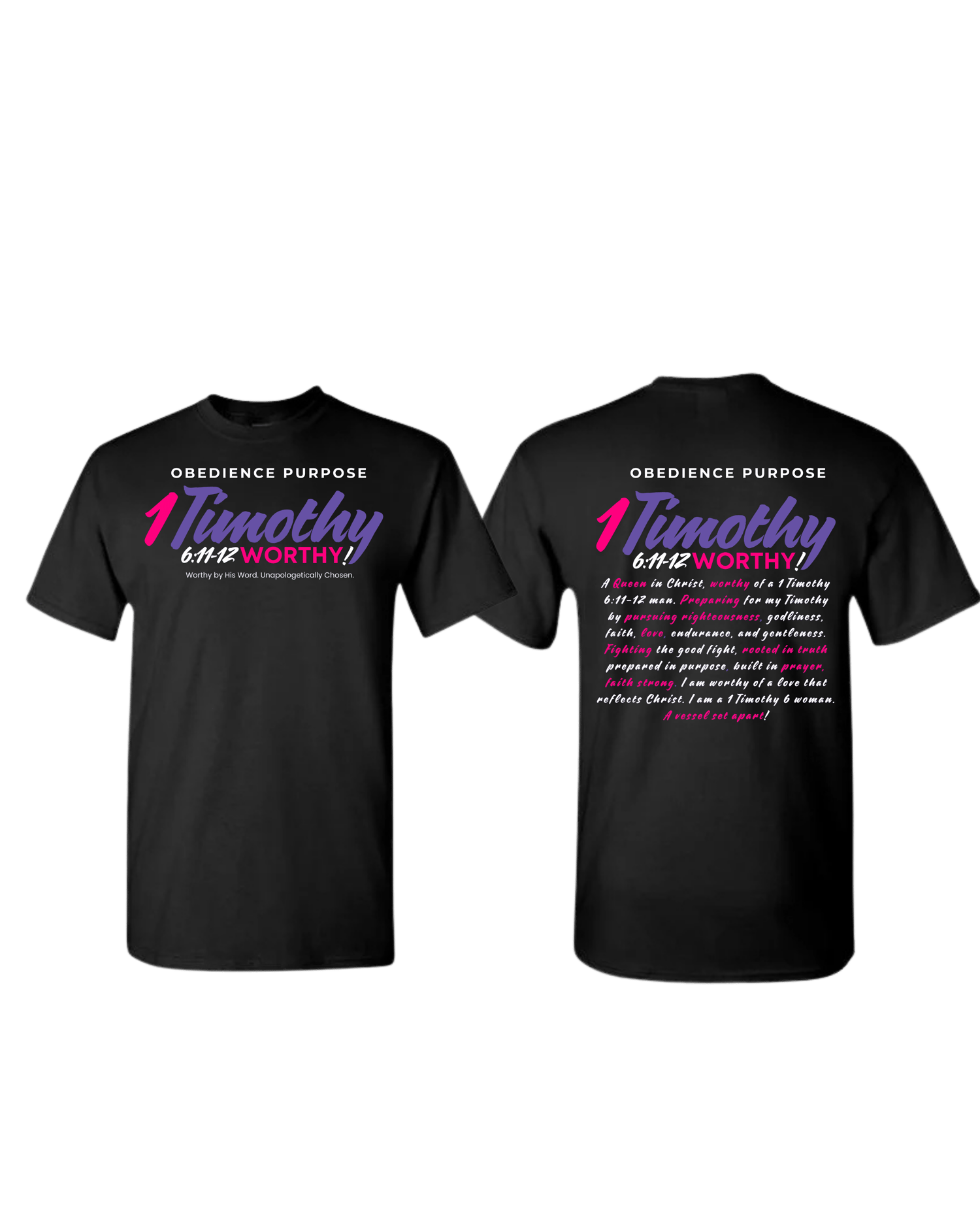Declare your identity in Christ with boldness and purpose in our 1 Timothy 6:11–12 “Worthy” Tee. This faith-based design from Obedience Purpose is more than just apparel—it’s a declaration. The front features a vibrant script of “1 Timothy WORTHY!” while the back speaks life with a powerful message affirming your worth, faith, and pursuit of righteousness.