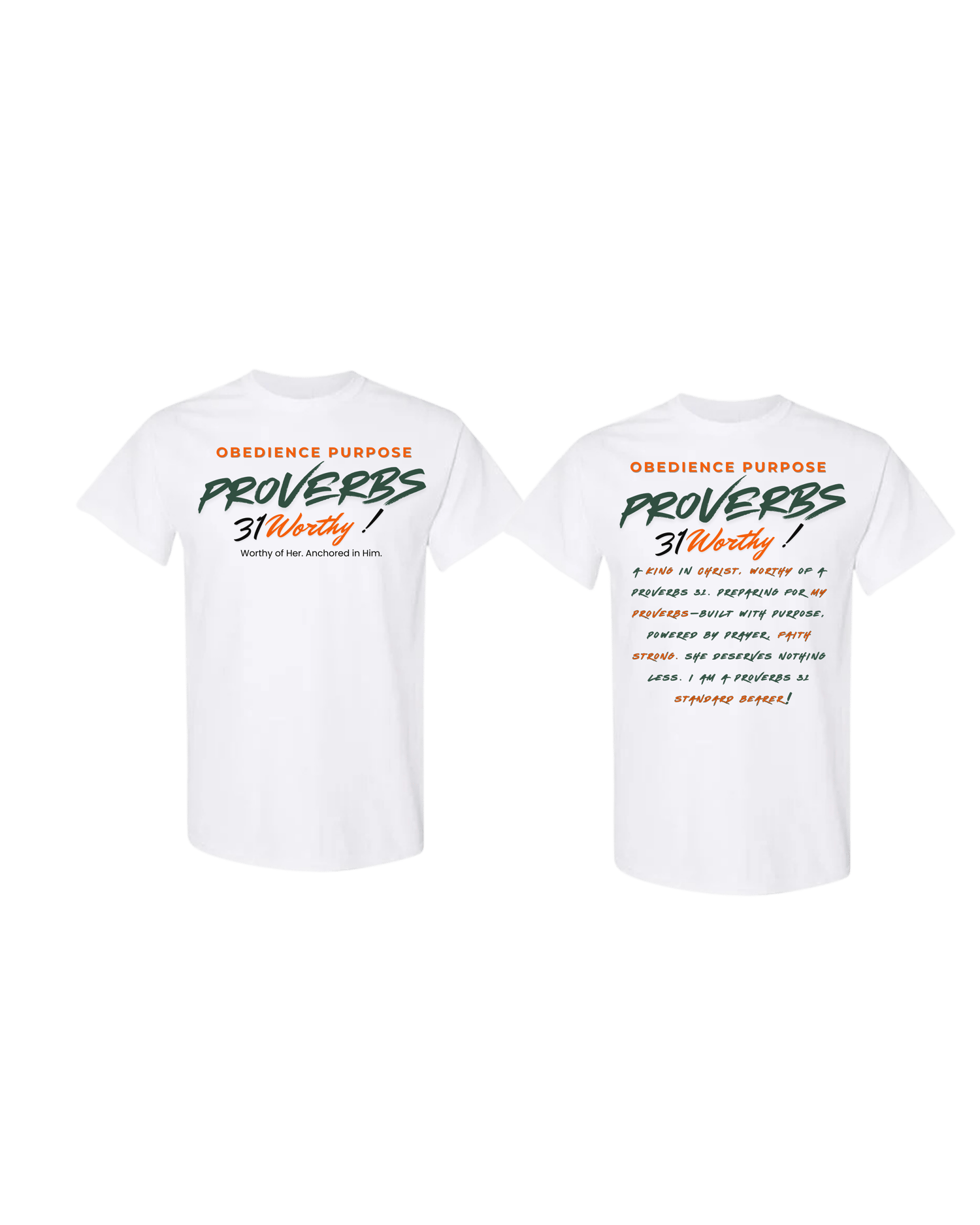 Step boldly into your identity with the Proverbs 31 “Worthy” Tee by Obedience Purpose. This shirt speaks to the heart of a man who values virtue and walks in spiritual leadership. The front boldly reads “Proverbs 31 Worthy!” and the back declares your commitment to being the kind of man who honors and uplifts a woman of God.